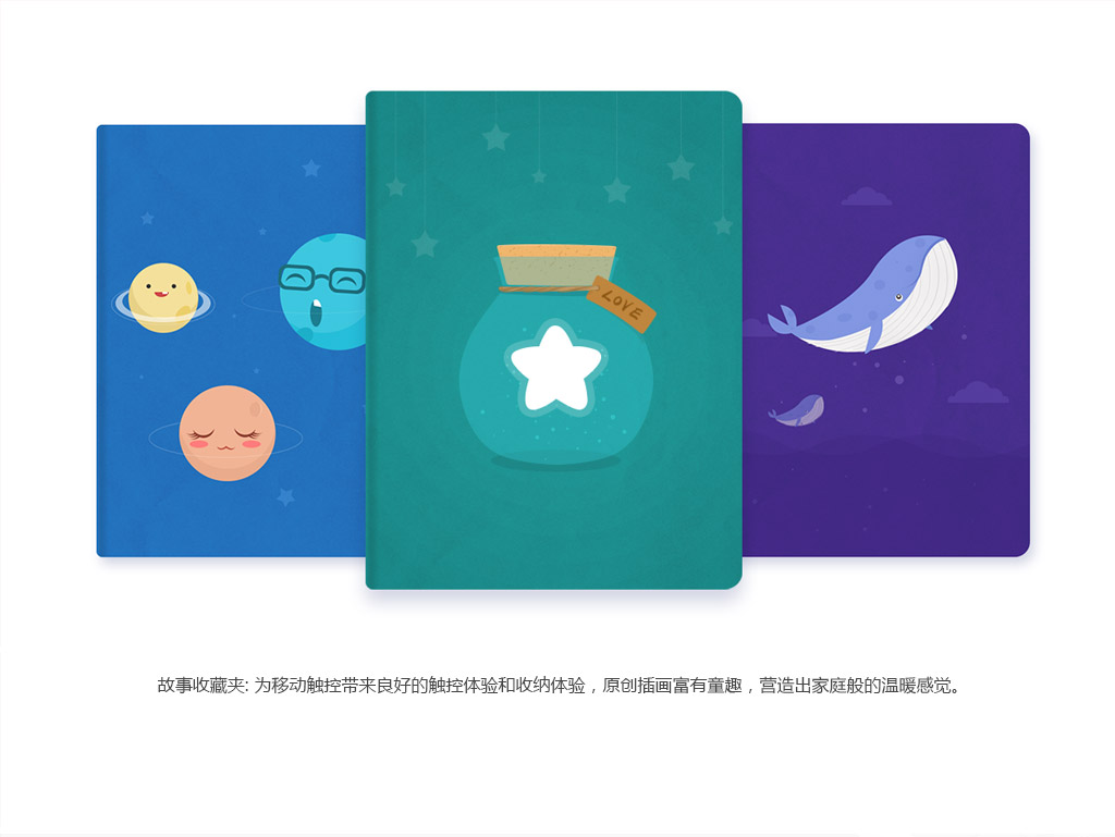 故事收藏夹: 为移动触控带来良好的触控体验和收纳体验,原创插画富有童趣,营造出家庭般的温暖感觉。
