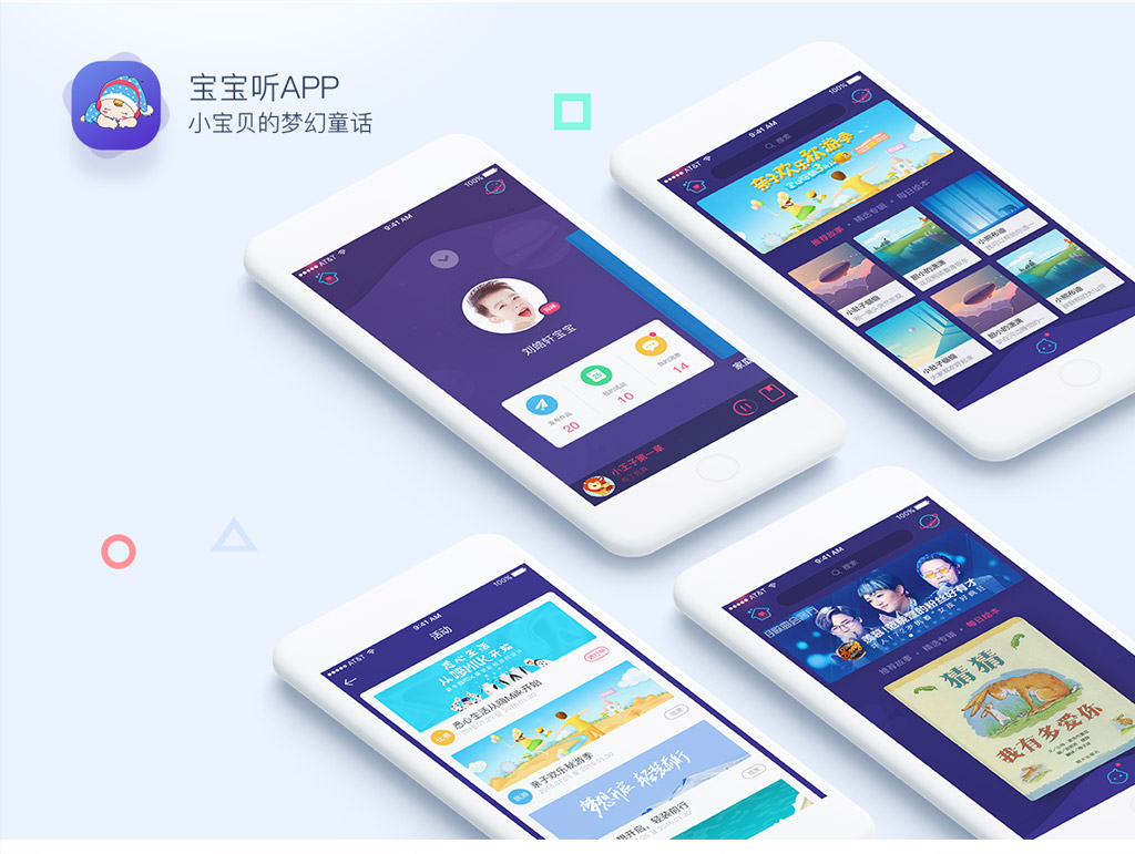 宝宝听是一款宝宝音乐启蒙APP,为了迎合APP所营造的舒缓、柔和的调性,我们细心调制具有静谧、梦幻感觉的蓝紫色作为背景色,配以清晰、易辨认、易操作的设计布局,打造出一套童话般的梦幻视觉风格,让父母及孩子一眼就爱上。