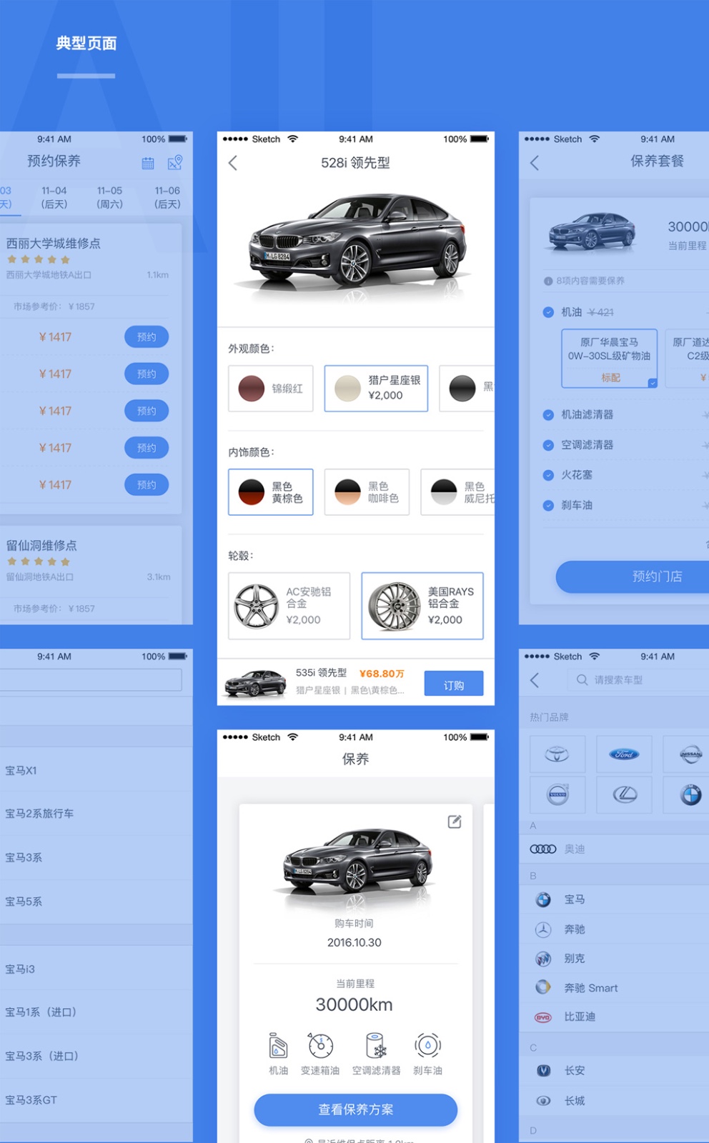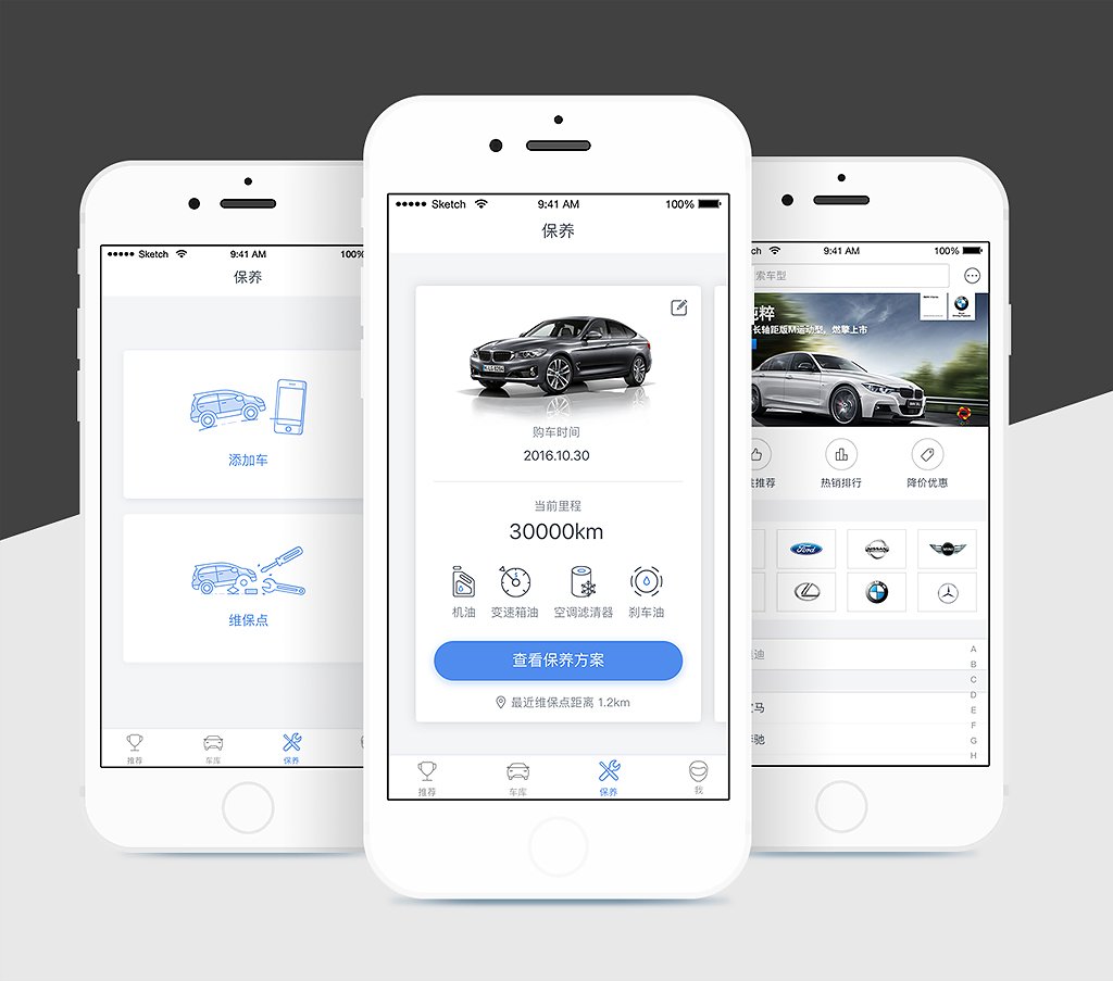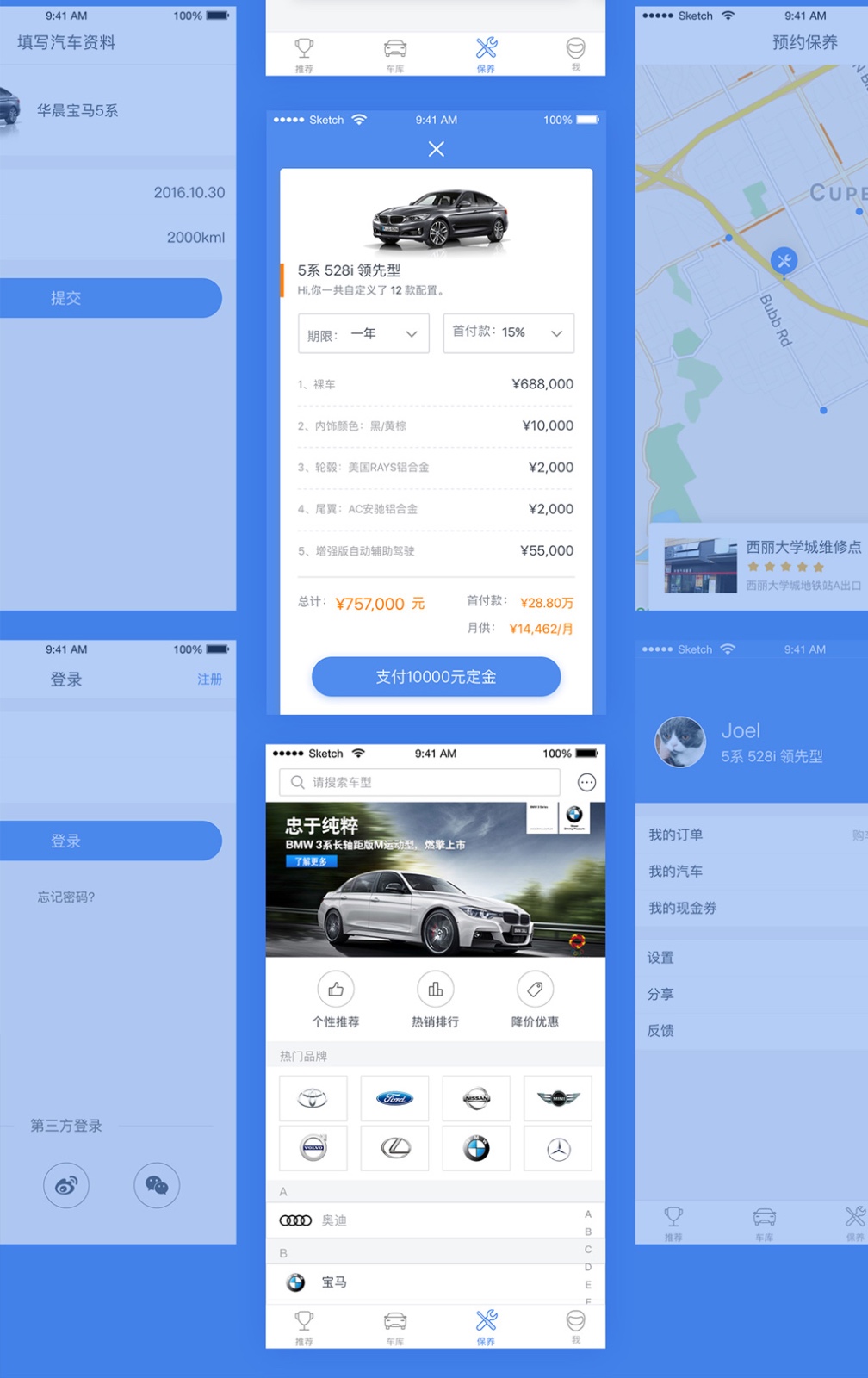 首页摒弃了常见的BANNER加图文排版的方式,直接呈现出APP的核心内容-定制购车。后期新增的需求想做汽车社区,增加了一个“车库”的模块,可以查询骑车相关咨询与报价。保修模块主要为第三方店铺加盟的方式,匹配最近的店铺,进行预约。