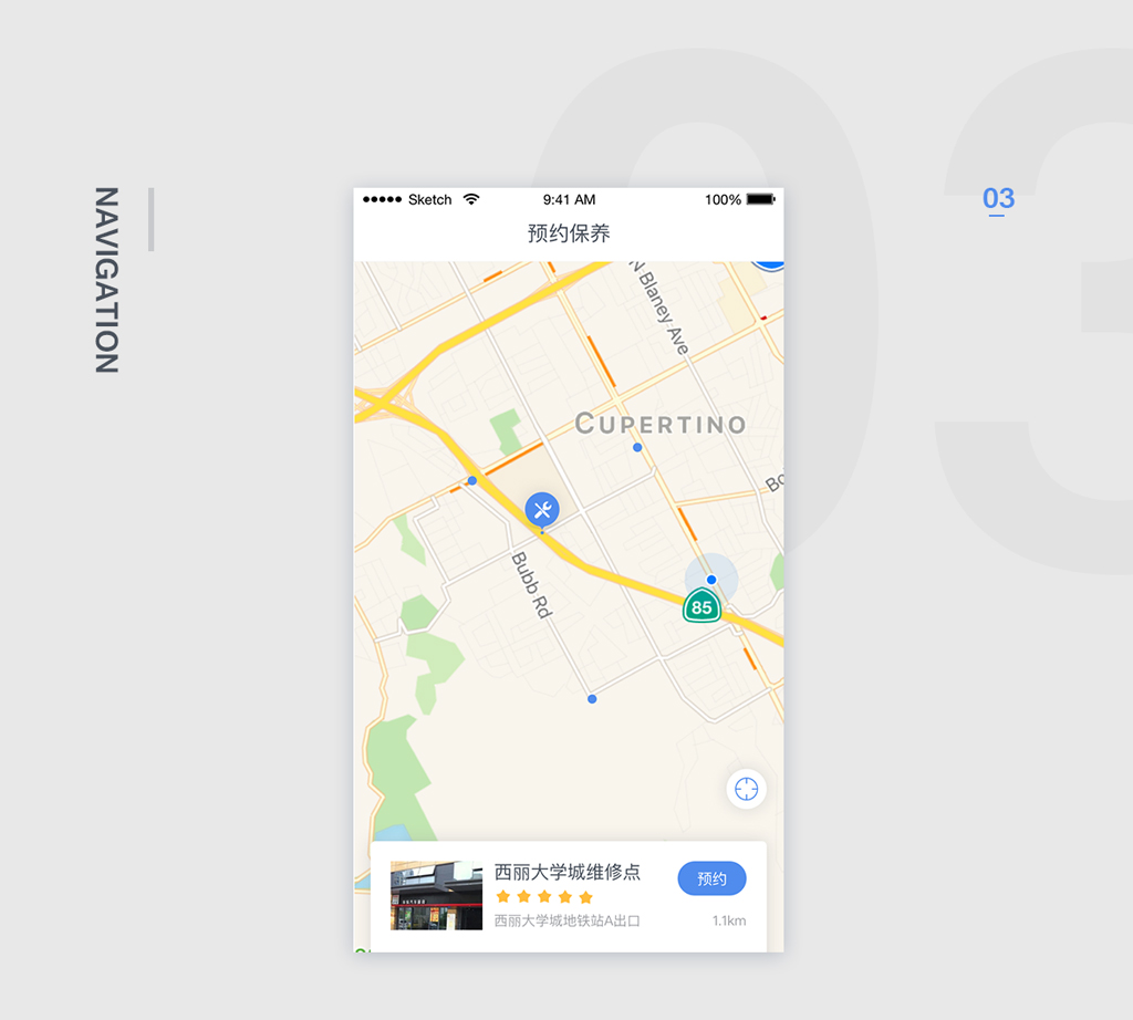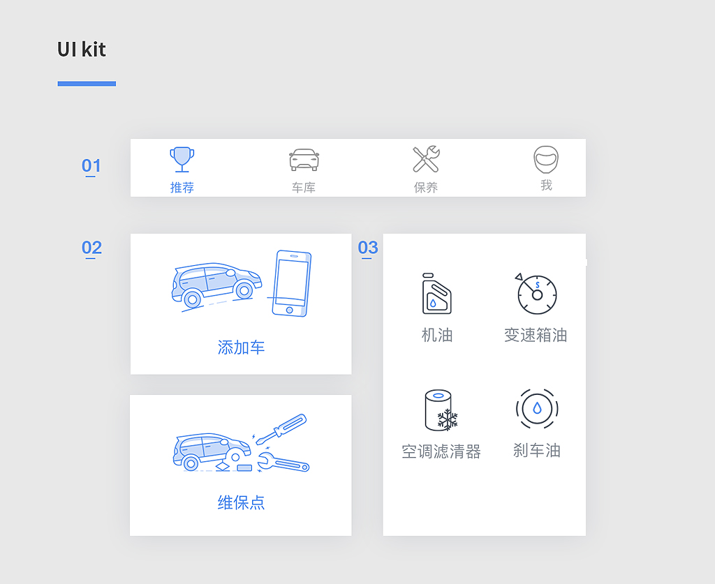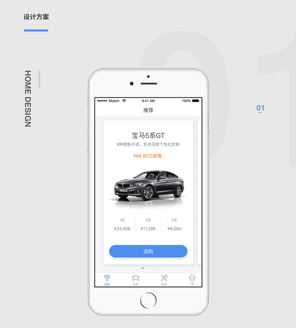首页摒弃了常见的BANNER加图文排版的方式,直接呈现出APP的核心内容-定制购车。后期新增的需求想做汽车社区,增加了一个“车库”的模块,可以查询骑车相关咨询与报价。保修模块主要为第三方店铺加盟的方式,匹配最近的店铺,进行预约。