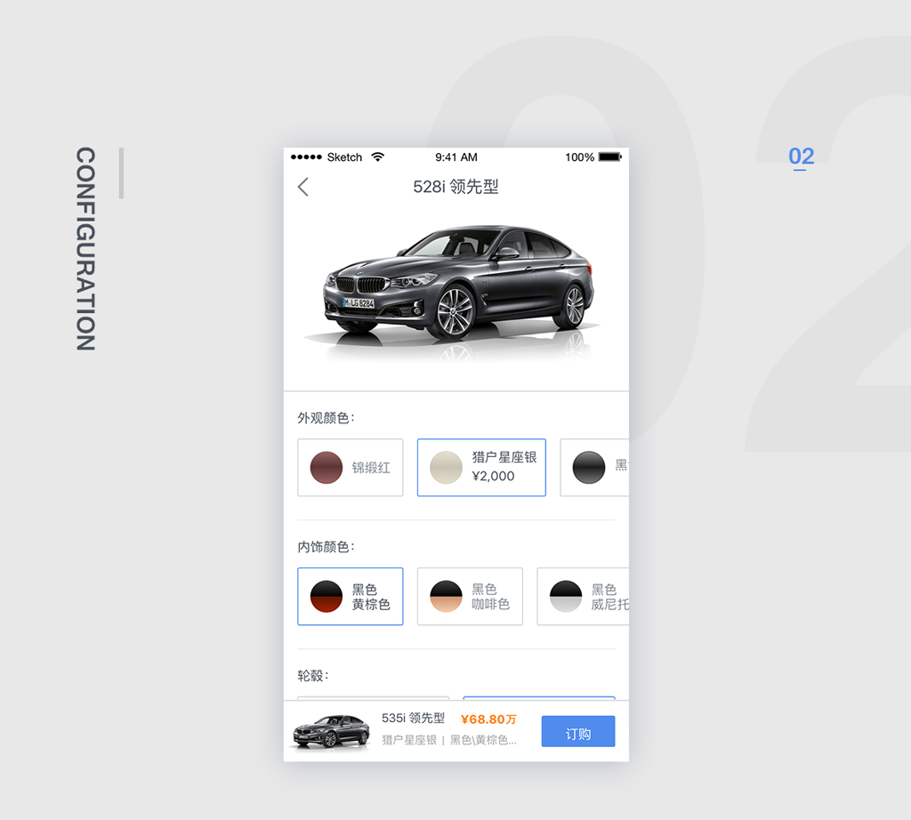 整个项目设计到购买,维保两大模块。前者类似于电商销售,后者类似于020类型。购买、定制模块根据需求我们参考了现有的特拉斯官网。从最基础的颜色、轮廓...到深度定制的科技部(360°可视摄像头,行车记录仪...),根据所见即所得原则,当选项改变时,预览区域也相对进行变更。